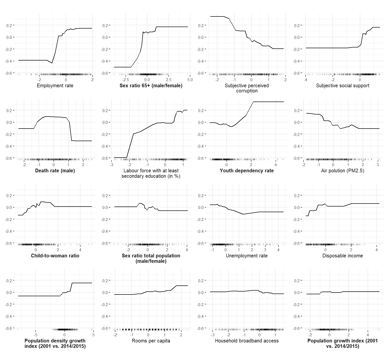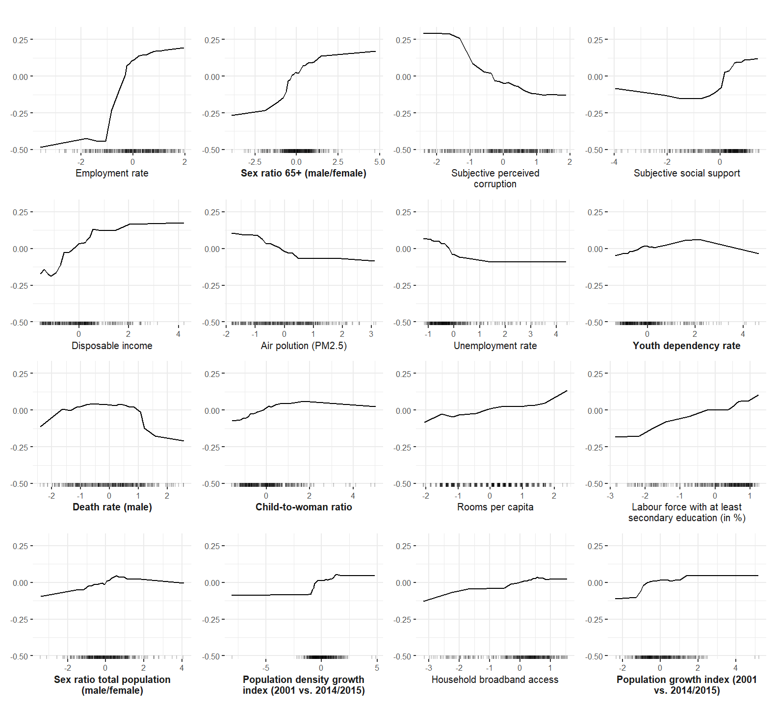 Finally, the functional form of the interaction of the employment rate and the sex ratio of the elderly is computed and plotted. The final plot from the manuscript in which the different interactions are depicted is compiled below.